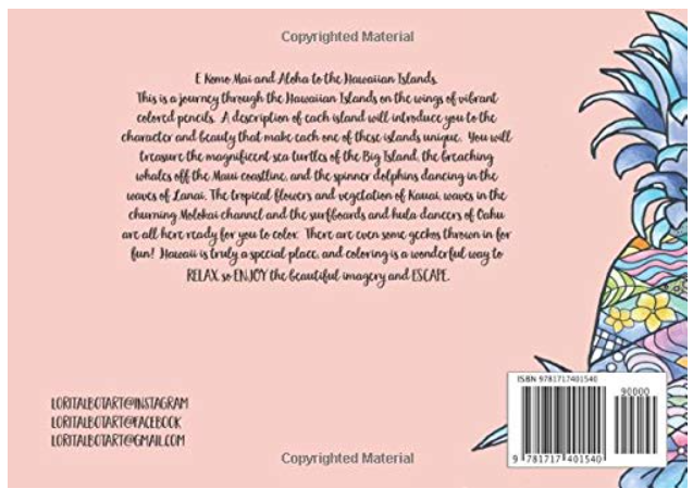 This is a journey through the Hawaiian islands, while coloring. A description of each island will introduce you to characteristics and beauty that make each one of these islands unique. This book is a 6 X 8.5 horizontal book for those who like to take their coloring books on the go, this is the perfect size for you. This adult coloring book has 54 unique, original hand-drawn, colorable designs. You will treasure the turtles of the big island, the whales off the Maui coastline, or the spinner dolphins off of Lanai. Flowers and vegetation of Kauai, waves in the Molokai channel and Surfboards and Hula dancers of Oahu are all here ready for you to color. There are even some geckos to color for more fun! Hawaii is truly a special place for everyone, and coloring is a wonderful way to so RELAX, ENJOY and ESCAPE.