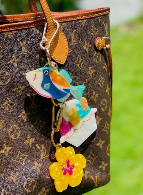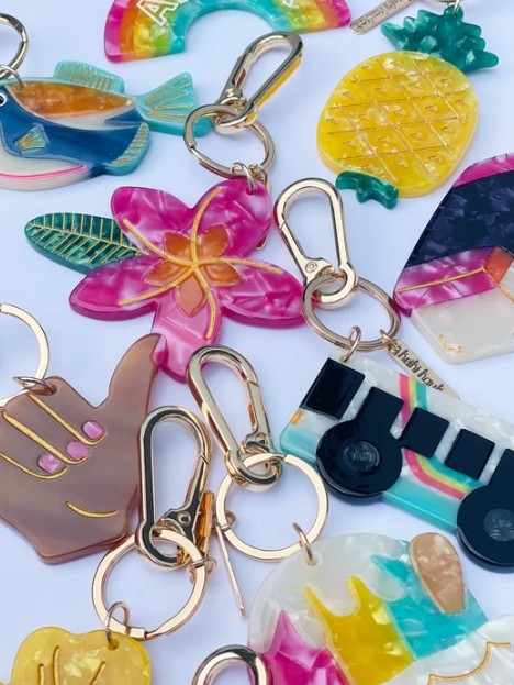 Island-style bling for purses, backpacks, keys + more. Made with cellulose acetate, a durable eco-plastic that comes from plant fibers!