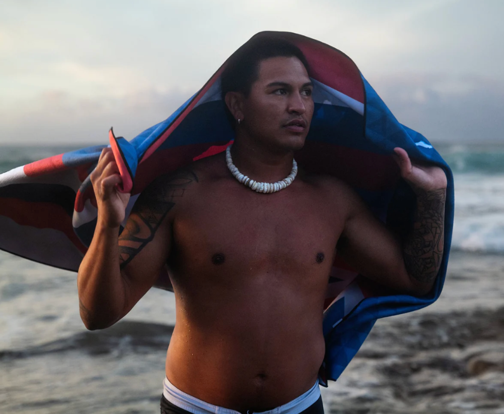 On one side, Ka Hae Hawai'i (the Hawaiian flag); on the other, the 'Āina (the islands). This lightweight, sand-resistant towel is the perfect companion for your days at sea.